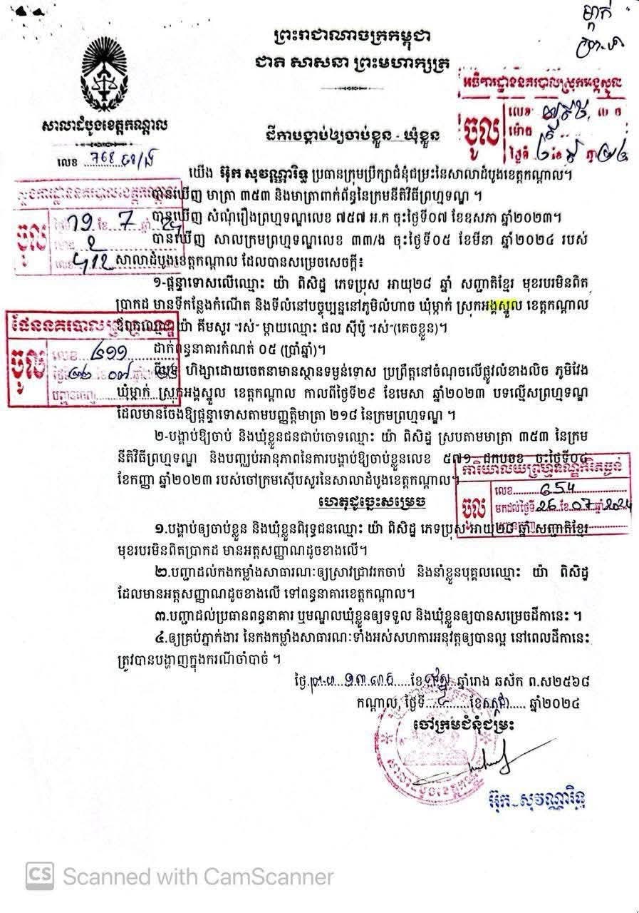 -មានដីកាបង្គាប់ឱ្យចាប់ខ្លួន-ឃុំខ្លួន លេខ៧៦៨ចខ/ង ចុះថ្ងៃទី០៤ ខែកក្កដា ឆ្នាំ២០២៤ របស់ប្រធានក្រុមប្រឹក្សាជំនុំជម្រះ នៃសាលាដំបូងខេត្តកណ្តាល អ៊ុក សុវណ្ណារិទ្ធ ចោទពីបទហិង្សាដោយចេតនាមានស្ថានទម្ងន់ទោស ប្រព្រឹត្តនៅចំណុចផ្លូវលំខាងលិច ភូមិវែង ឃុំម្កាក់ ស្រុកអង្គស្នួល ខេត្តកណ្ដាល កាលពីថ្ងៃទី២៩ ខែមេសា ឆ្នាំ២០២៣ ។