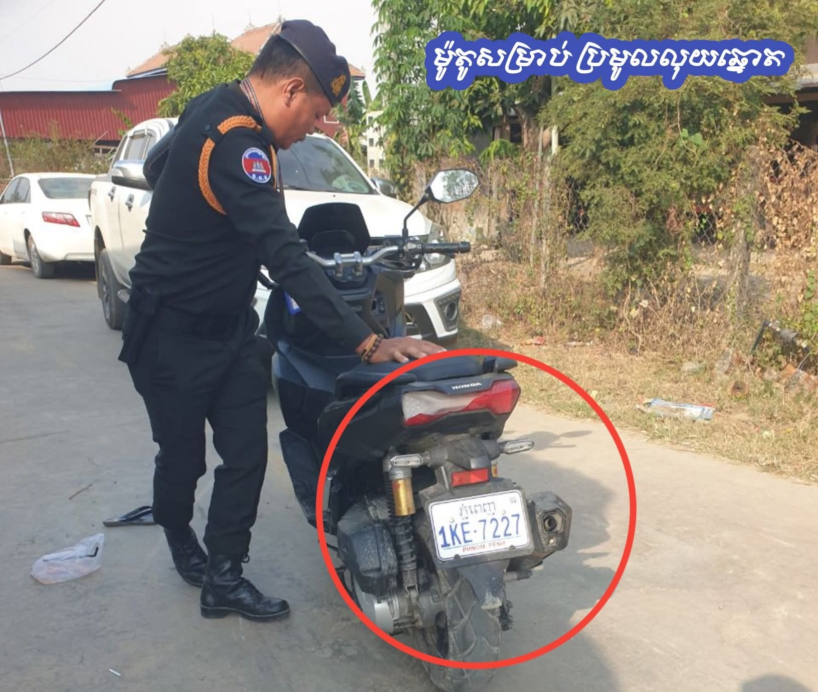 ២៖ ម៉ាកហុងដា adv ពណ៌ខ្មៅពាក់ស្លាកលេខ ភ្នំពេញ1KE.7227។
